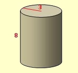 Berechne Volumen und Oberfläche eines Zylinders mit den Maßen r = 3 cm und h = 8 cm. V = π · 32 · 8 = 226,19 cm3 O = 2·π · 32 + 2·π·3·8 = 207,36 cm2 |