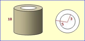 Ein Hohlzylinder der Höhe 10 cm hat einen Außenradius von 5 cm und einen Innenradius von 3 cm. Berechne Volumen und Oberfläche. V1 = π · 52 · 10 = 785,40 cm3 V2 = π · 32 · 10 = 282,74 cm3 V = 785,40 – 282,74 = 502,66 cm3 G = π · (52 – 32) = 50,27 cm2 (Kreisring) M1 = 2·π·5·10 = 314,16 cm2 M2 = 2·π·3·10 = 188,50 cm2 O = 2·50,27 + 314,16 + 188,50 = 603,20 cm2 |