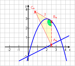 Berechne den Flächeninhalt der Dreiecke AnBnCn in Abhängigkeit von der Abszisse x der Punkte An im Bereich [-0,64 ; 2,14]. |