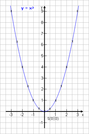 Hierzu berechnet man für unterschiedliche x, was jeweils herauskommt. Beispiel: Erstelle für die Funktion y = x2 eine Wertetabelle für x ϵ [-3 ; 3] und ∆x = 0,5 und zeichne ihren Graph. (also von -3 bis 3, Schrittweite = 0,5) ![]() Rechts siehst du das Ergebnis. |