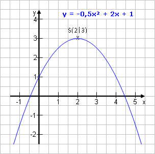 Erstelle für die Funktion y = -0,5x2 + 2x + 1 eine Wertetabelle für x ϵ [-1 ; 5] und ∆x = 1 und zeichne ihren Graph. ![]() Rechts siehst du wieder das Ergebnis. |