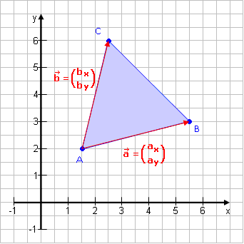 Wie du an der Zeichnung rechts siehst, wird ein Dreieck im Koordinatensystem aus zwei Vektoren aufgespannt. Sie laufen von einem gemeinsamen Eckpunkt zu den beiden anderen Eckpunkten, z.B. von A zu B und C. Die Koordinaten der Punkte sind uns bekannt!