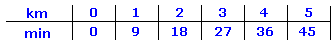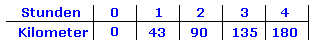 | Für einen Kilometer braucht ein flotter Fußgänger etwa 9 Minuten. Erstelle Wertetabelle und Graph für 0 bis 5 km. |
