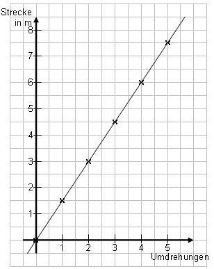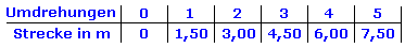 | Je Radumdrehung legt das Rad von Bernds Schwester 1,50 m zurück. Erstelle Wertetabelle und Graph für 0 bis 5 Radumdrehungen. |