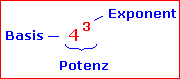 Statt 4 · 4 · 4 schreibt man 43. Die 4 wird drei mal mit sich selbst multipliziert. Das Ganze, also 43 heißt Potenz. Die Zahl unten heißt Basis. Die Zahl oben heißt Hochzahl oder Exponent. |