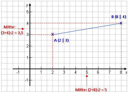 Nehmen wir A (2 | 3) und B (8 | 4). Wo liegt der Mittelpunkt? |