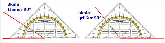 Winkel über 180° kann man nicht direkt ablesen. Lese stattdessen den Winkel ab, der über 180° hinaus geht und addiere ihn zu 180°. Oder lese den Gegenwinkel ab und ziehe diesen von 360° ab. |