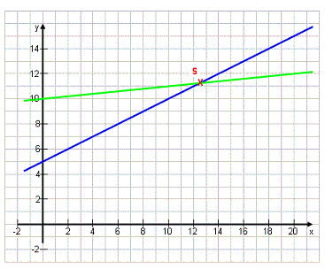 Gegeben seien die beiden Handy-Tarife: y = 0,5·x + 5,00 und y = 0,1·x + 10,00 (5 € Grundgebühr und 50 Ct pro Minute und 10 € Grundgebühr und 10 Ct/min). Bei welcher Minutenzahl wird der zweite Tarif günstiger als der erste? Wir zeichnen beide Geraden und lesen den Schnittpunkt ab: S(12,5|11,25) Lösung: Ab 12,5 Minuten (bzw. 11,25 €) ist der Tarif mit 10 € Grundgebühr günstiger. |