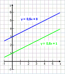Auch dies ist möglich: Unser Problem hat keine Lösung. Grafisch sieht man sofort, wann dies passiert: Wenn beide Geraden parallel verlaufen. Beispiel: Bei welcher Minutenanzahl liefern die beiden Tarife y = 0,5·x + 1 und y = 0,5·x + 3 die gleichen Kosten? Antwort: Nie! Weil der zweite Tarif immer über dem ersten liegt. Er startet höher und steigt gleich schnell an. Die beiden Geraden verlaufen mit der gleichen Steigung, also parallel. |