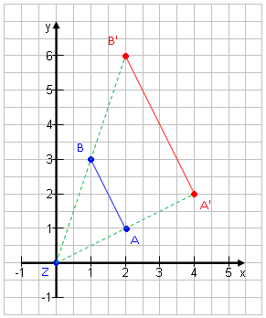 Wir starten mit minimalem Aufwand: Wir strecken die Strecke AB mit A(2|1)und B(1|3) von dem Punkt Z(0|0) aus um den Faktor k = 2. (Wir verdoppeln die Länge.)· Miss den Abstand von A zum Zentrum Z: 2,2 cm · Multipliziere mit k: 2,2 · 2 = 4,4 cm · Zeichne A' im Abstand von 4,4 cm von Z ein. · Miss den Abstand von B zum Zentrum Z: 3,2 cm · Multipliziere mit k: 3,2 · 2 = 6,4 cm · Zeichne B' im Abstand von 6,4 cm von Z ein. · Verbinde die beiden Punkte. |