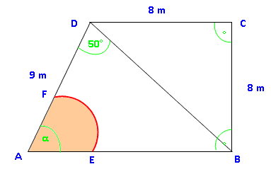 A Viereck = A Dreieck1 + A Dreieck2A Dreieck1 = 0,5 · 8 · 8 = 32 m 2 BD 2 = 8 2 + 8 2 | √ BD = 11,31 m A Dreieck2 = 0,5 · 9 · 11,31 · sin 50° = 38,99 m 2A Viereck = 32 + 38,99 = 70,99 m 2 AB 2 = 9 2 + 11,31 2 – 2·9·11,31·cos 50° | √ AB = 8,84 m 11,31 2 = 9 2 + 8,84 2 – 2·9·8,84·cos α α = 78,68° A Sektor =